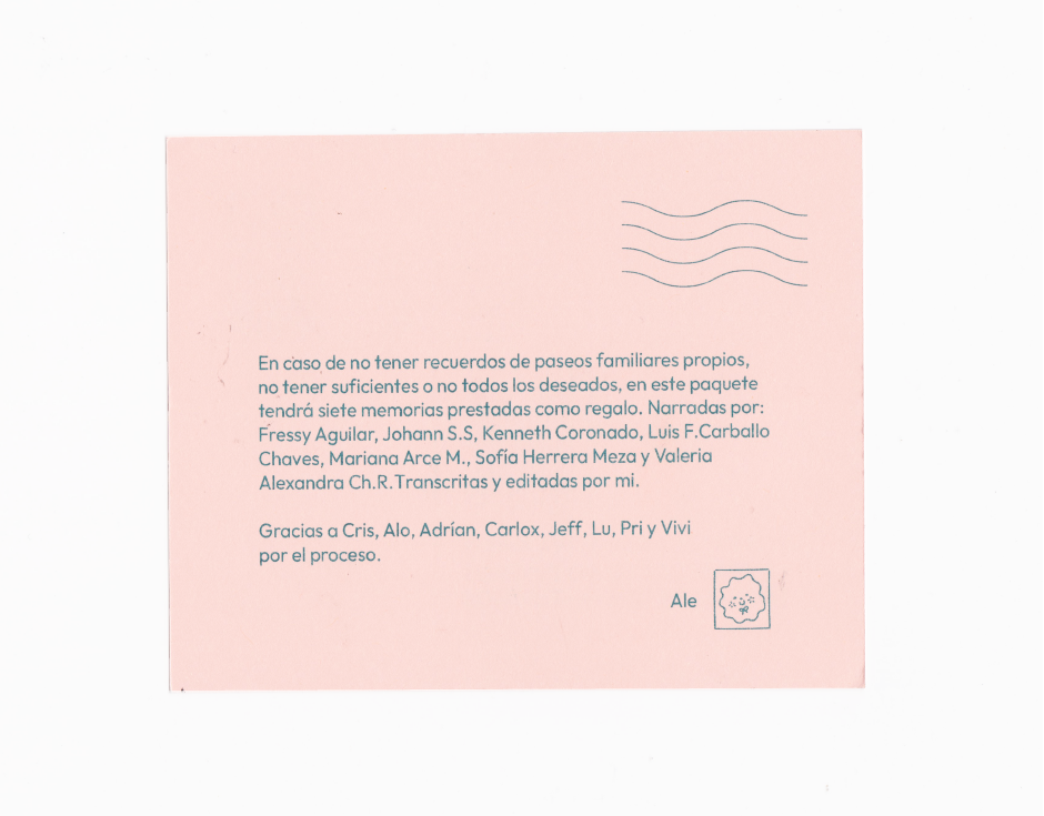 El proyecto son 7 relatos transcritos sobre recuerdos de paseos familiares de la infancia. El resultado es un paquete postal con 7 sobres.